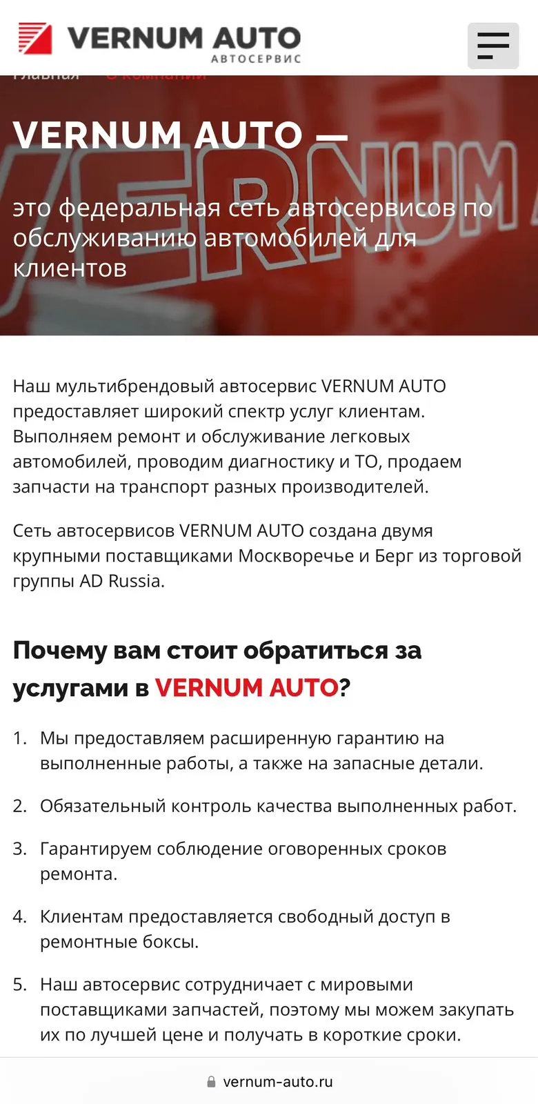 VERNUM AUTO - это федеральная сеть автосервисов по обслуживанию автомобилей любых марок. Сеть СТО VERNUM AUTO предоставляет широкий спектр услуг клиентам. Они выполняют ремонт и обслуживание легковых автомобилей, проводят диагностику и ТО, продают запчасти на транспорт разных производителей. Сеть автосервисов была создана двумя крупными поставщиками Москворечье и Берг из торговой группы AD Russia.